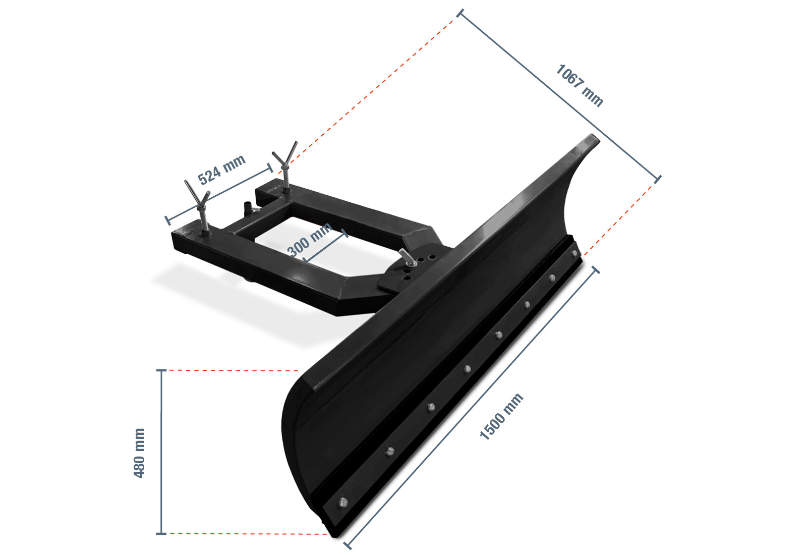 Het sneeuwblad voor de vorkheftruck heeft vorkkokers van 130 × 55 mm. De zakken liggen 300 mm uit elkaar, dus de vorken op de vorkheftruck moeten aan deze afmetingen kunnen worden aangepast. Zorg ervoor dat ze horizontaal zijn genivelleerd - de praktische steun op de sneeuwschuiver helpt hierbij. Rijd gewoon naar binnen, draai de vergrendelingsschroeven vast en til de sneeuwschuiver op. De vorkheftruck moet een trekgewicht van 2 ton hebben.