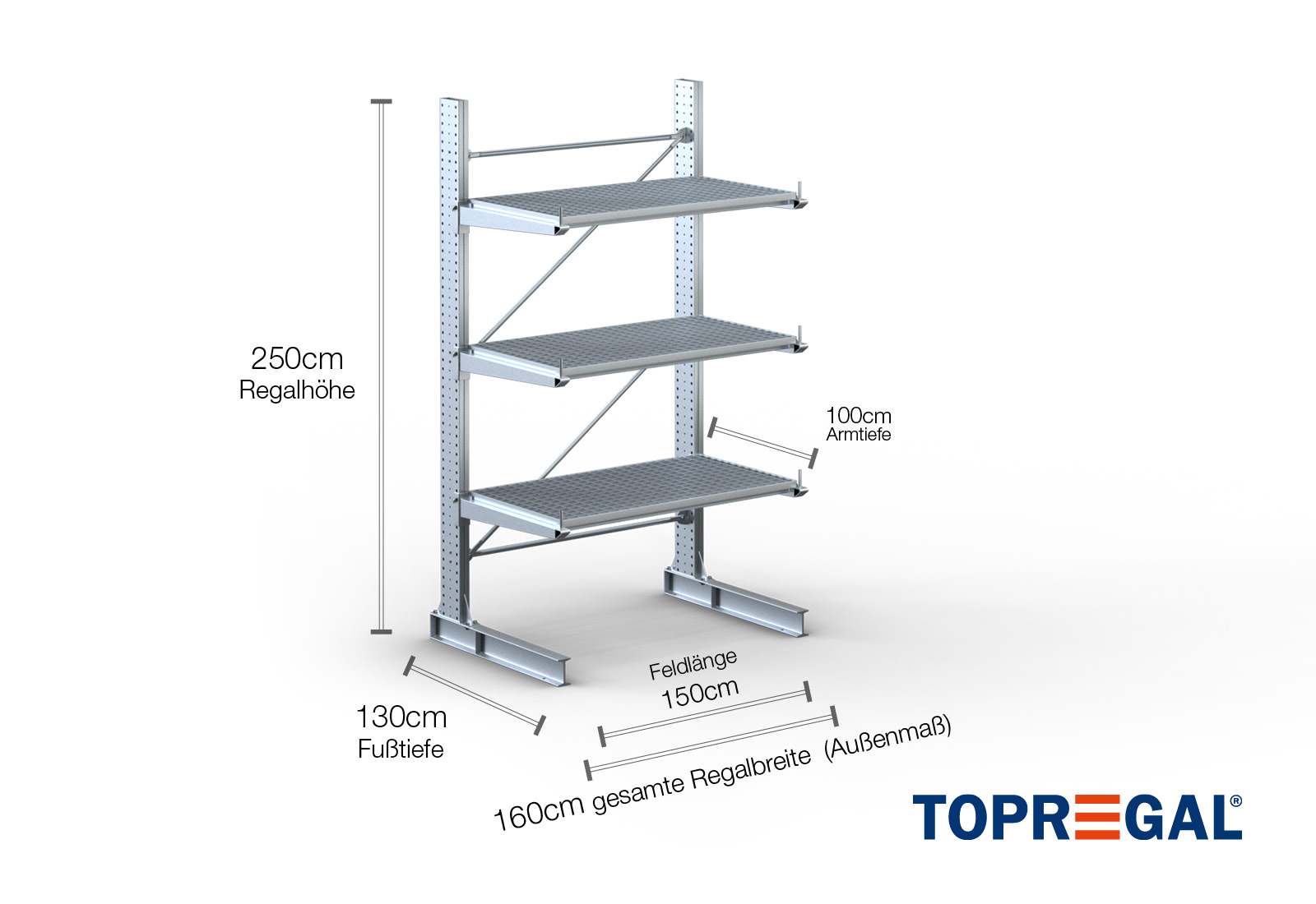 Deze draagarmstelling als eenzijdige uitvoering met een breedte van 1,6 m is 2,5 m hoog, heeft een totale diepte van 130 cm en beschikt over 3 draagarmniveaus, met een armdiepte van 100 cm. De belasting per arm bedraagt hierbij maximaal 500 kg. De draagarmen kunnen individueel in een rooster van 50 mm worden gehaakt en worden geborgd door middel van veiligheidsbouten en -pinnen. Ook de voetdelen kunnen (afhankelijk van de goederen) als opslagniveau worden gebruikt. Om de lading tegen onbedoeld verschuiven te beschermen, kan aan het einde van elke draagarm een afrolbeveiliging gestoken worden. Dit is standaard bij de leveringsomvang inbegrepen.