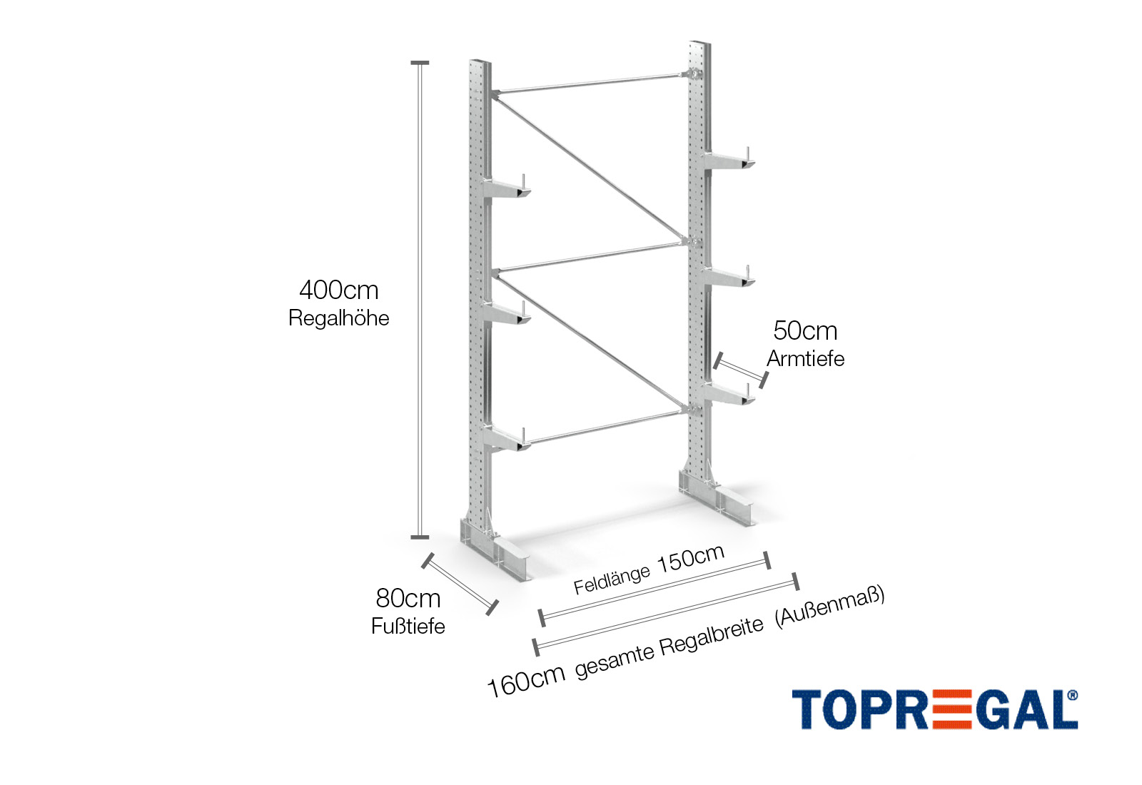 Deze draagarmstelling als eenzijdige uitvoering met een breedte van 1,6 m is 4 m hoog, heeft een totale diepte van 80 cm en beschikt over 3 draagarmniveaus, met een armdiepte van 50 cm. De belasting per arm bedraagt hierbij maximaal 500 kg. De draagarmen kunnen individueel in een rooster van 50 mm worden gehaakt en worden geborgd door middel van veiligheidsbouten en -pinnen. Ook de voetdelen kunnen (afhankelijk van de goederen) als opslagniveau worden gebruikt. Om de lading tegen onbedoeld verschuiven te beschermen, kan aan het einde van elke draagarm een afrolbeveiliging gestoken worden. Dit is standaard bij de leveringsomvang inbegrepen.