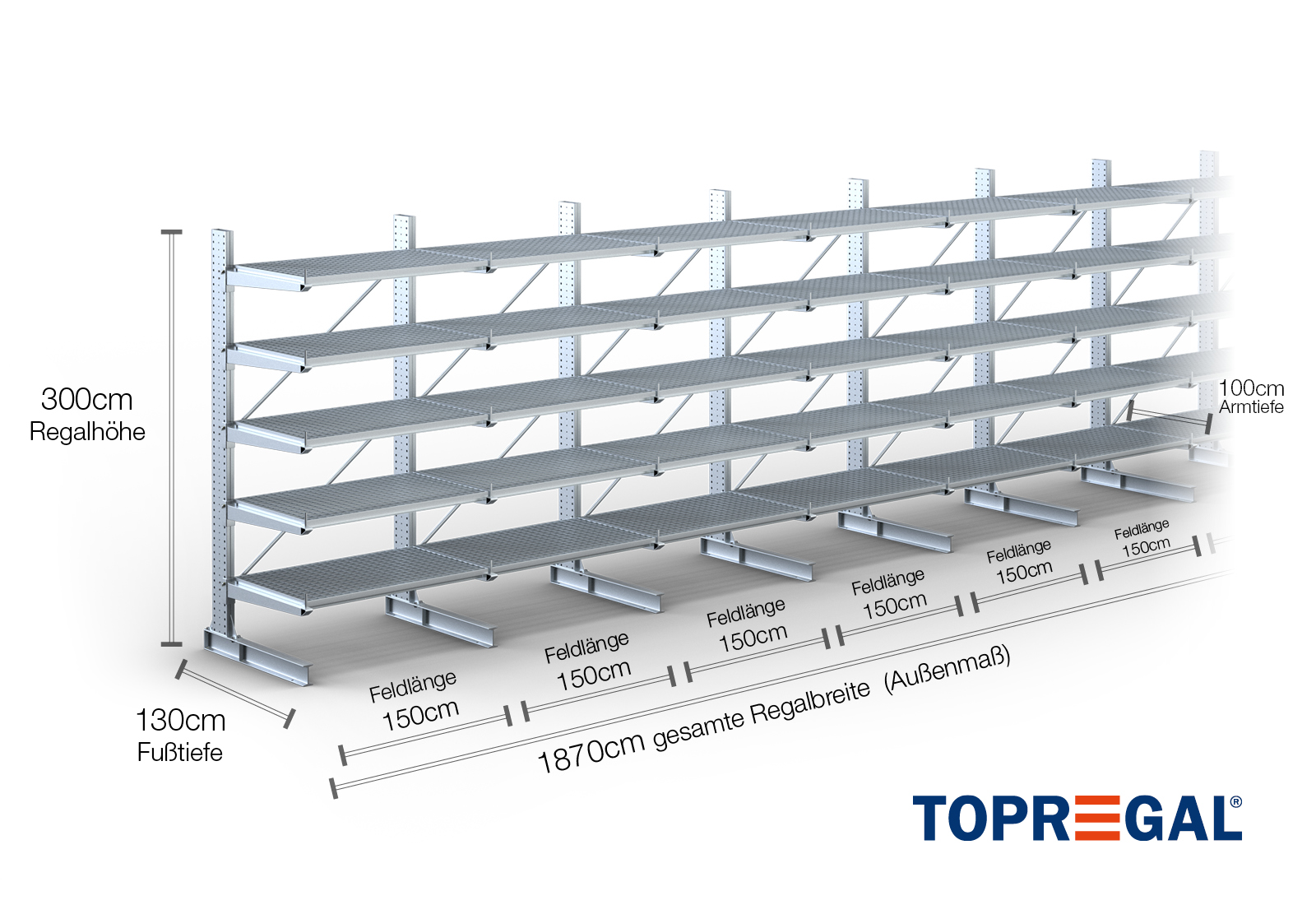 Deze draagarmstelling als eenzijdige uitvoering met een breedte van 18,7 m is 3 m hoog, heeft een totale diepte van 130 cm en beschikt over 5 draagarmniveaus, met een armdiepte van 100 cm. De belasting per arm bedraagt hierbij maximaal 500 kg. De draagarmen kunnen individueel in een rooster van 50 mm worden gehaakt en worden geborgd door middel van veiligheidsbouten en -pinnen. Ook de voetdelen kunnen (afhankelijk van de goederen) als opslagniveau worden gebruikt. Om de lading tegen onbedoeld verschuiven te beschermen, kan aan het einde van elke draagarm een afrolbeveiliging gestoken worden. Dit is standaard bij de leveringsomvang inbegrepen.