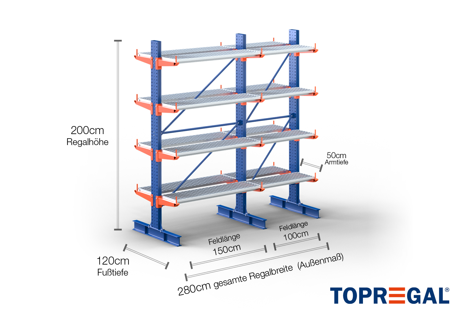 Deze draagarmstelling als dubbelzijdige uitvoering met een breedte van 2,8 m is 2 m hoog, heeft een totale diepte van 120 cm en beschikt over 4 draagarmniveaus, met een armdiepte van 50 cm. De belasting per arm bedraagt hierbij maximaal 500 kg. De draagarmen kunnen individueel in een rooster van 50 mm worden gehaakt en worden geborgd door middel van veiligheidsbouten en -pinnen. Ook de voetdelen kunnen (afhankelijk van de goederen) als opslagniveau worden gebruikt. Om de lading tegen onbedoeld verschuiven te beschermen, kan aan het einde van elke draagarm een afrolbeveiliging gestoken worden. Dit is standaard bij de leveringsomvang inbegrepen.