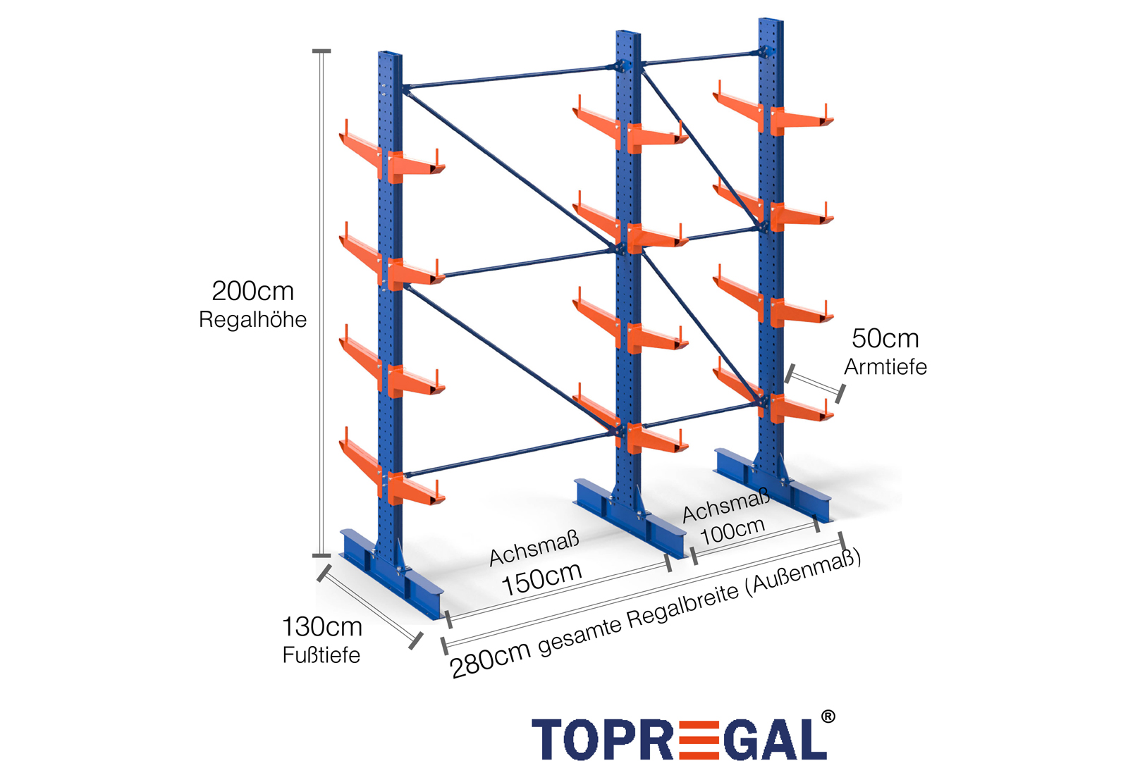 Deze draagarmstelling als dubbelzijdige uitvoering met een breedte van 2,8 m is 2 m hoog, heeft een totale diepte van 120 cm en beschikt over 4 draagarmniveaus, met een armdiepte van 50 cm. De belasting per arm bedraagt hierbij maximaal 500 kg. De draagarmen kunnen individueel in een rooster van 50 mm worden gehaakt en worden geborgd door middel van veiligheidsbouten en -pinnen. Ook de voetdelen kunnen (afhankelijk van de goederen) als opslagniveau worden gebruikt. Om de lading tegen onbedoeld verschuiven te beschermen, kan aan het einde van elke draagarm een afrolbeveiliging gestoken worden. Dit is standaard bij de leveringsomvang inbegrepen.