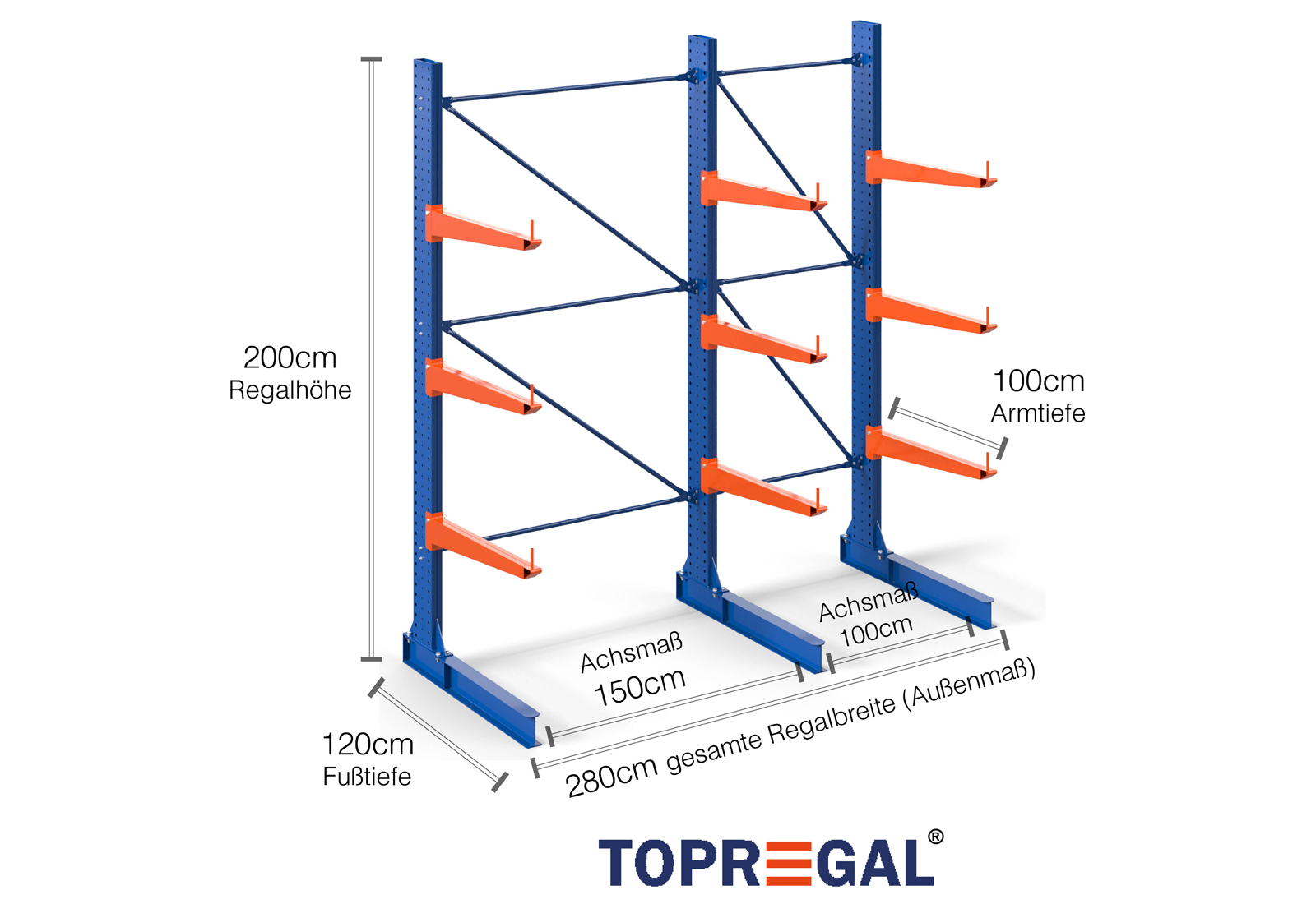 Deze draagarmstelling als eenzijdige uitvoering met een breedte van 2,8 m is 2 m hoog, heeft een totale diepte van 120 cm en beschikt over 3 draagarmniveaus, met een armdiepte van 100 cm. De belasting per arm bedraagt hierbij maximaal 500 kg. De draagarmen kunnen individueel in een rooster van 50 mm worden gehaakt en worden geborgd door middel van veiligheidsbouten en -pinnen. Ook de voetdelen kunnen (afhankelijk van de goederen) als opslagniveau worden gebruikt. Om de lading tegen onbedoeld verschuiven te beschermen, kan aan het einde van elke draagarm een afrolbeveiliging gestoken worden. Dit is standaard bij de leveringsomvang inbegrepen.