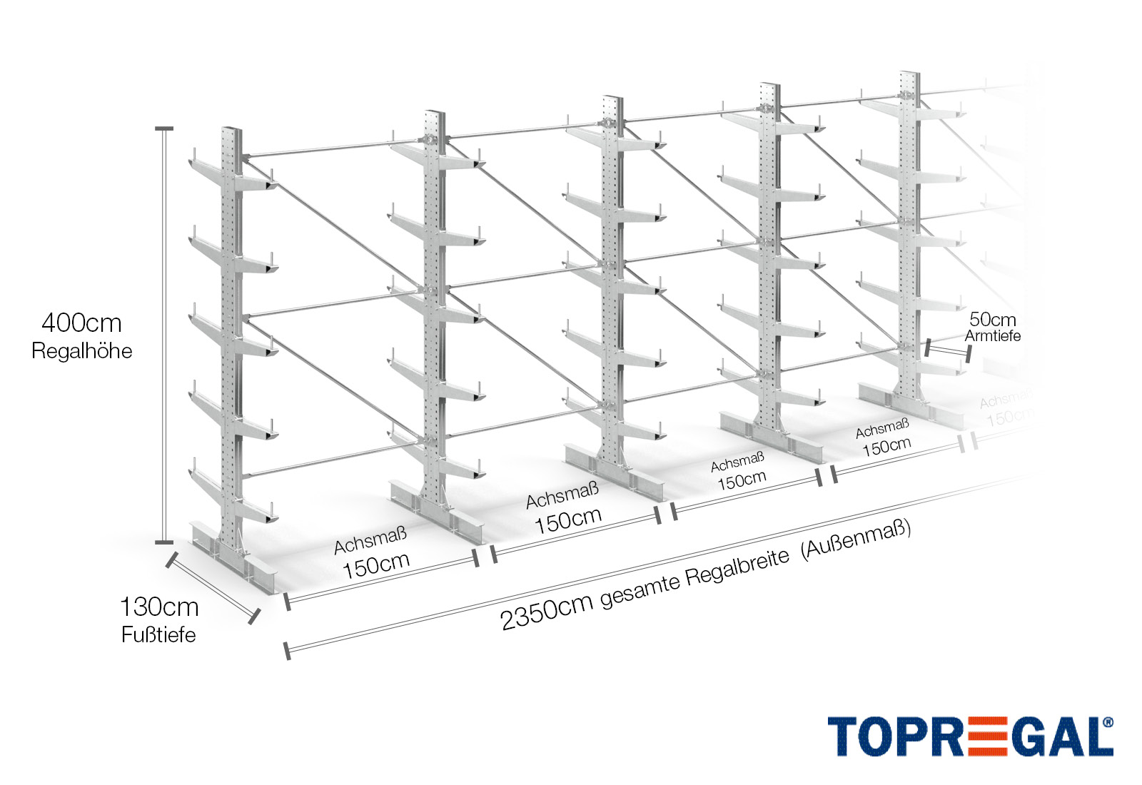 Deze draagarmstelling als dubbelzijdige uitvoering met een breedte van 23,5 m is 4 m hoog, heeft een totale diepte van 120 cm en beschikt over 5 draagarmniveaus, met een armdiepte van 50 cm. De belasting per arm bedraagt hierbij maximaal 500 kg. De draagarmen kunnen individueel in een rooster van 50 mm worden gehaakt en worden geborgd door middel van veiligheidsbouten en -pinnen. Ook de voetdelen kunnen (afhankelijk van de goederen) als opslagniveau worden gebruikt. Om de lading tegen onbedoeld verschuiven te beschermen, kan aan het einde van elke draagarm een afrolbeveiliging gestoken worden. Dit is standaard bij de leveringsomvang inbegrepen.