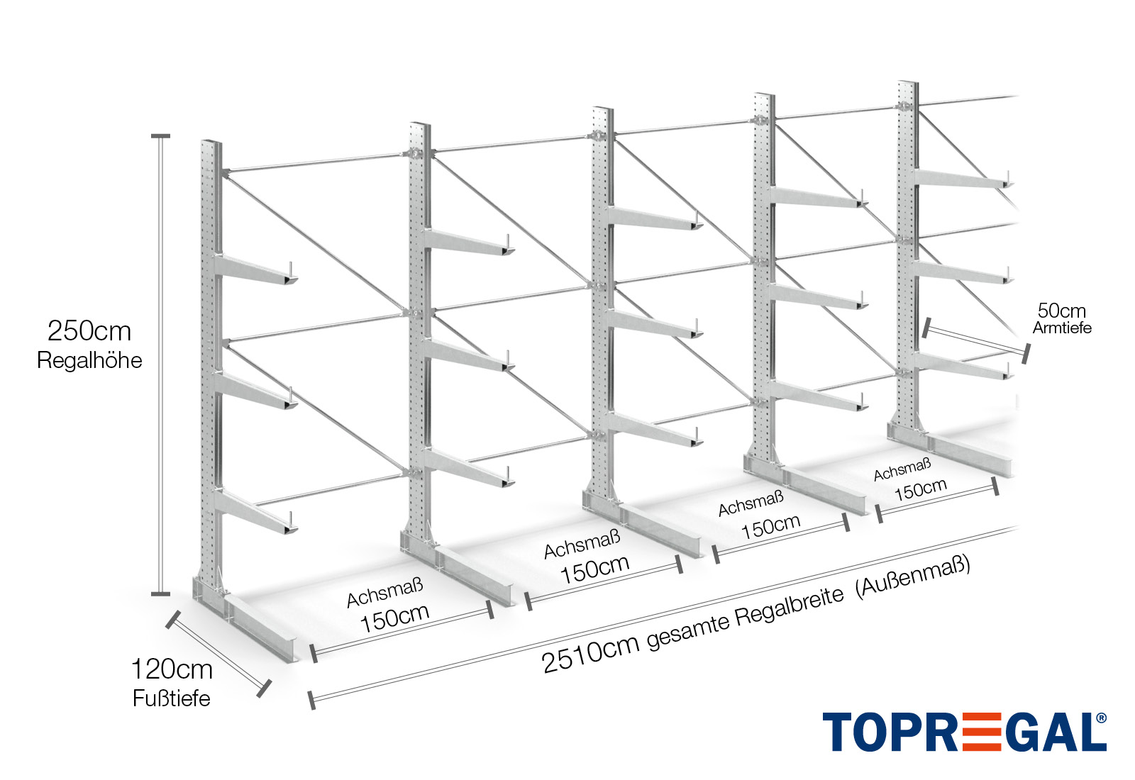 Deze draagarmstelling als eenzijdige uitvoering met een breedte van 25,1 m is 2,5 m hoog, heeft een totale diepte van 130 cm en beschikt over 3 draagarmniveaus, met een armdiepte van 100 cm. De belasting per arm bedraagt hierbij maximaal 500 kg. De draagarmen kunnen individueel in een rooster van 50 mm worden gehaakt en worden geborgd door middel van veiligheidsbouten en -pinnen. Ook de voetdelen kunnen (afhankelijk van de goederen) als opslagniveau worden gebruikt. Om de lading tegen onbedoeld verschuiven te beschermen, kan aan het einde van elke draagarm een afrolbeveiliging gestoken worden. Dit is standaard bij de leveringsomvang inbegrepen.