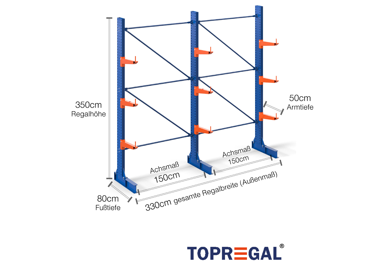 Deze draagarmstelling als eenzijdige uitvoering met een breedte van 3,3 m is 3,5 m hoog, heeft een totale diepte van 80 cm en beschikt over 3 draagarmniveaus, met een armdiepte van 50 cm. De belasting per arm bedraagt hierbij maximaal 500 kg. De draagarmen kunnen individueel in een rooster van 50 mm worden gehaakt en worden geborgd door middel van veiligheidsbouten en -pinnen. Ook de voetdelen kunnen (afhankelijk van de goederen) als opslagniveau worden gebruikt. Om de lading tegen onbedoeld verschuiven te beschermen, kan aan het einde van elke draagarm een afrolbeveiliging gestoken worden. Dit is standaard bij de leveringsomvang inbegrepen.