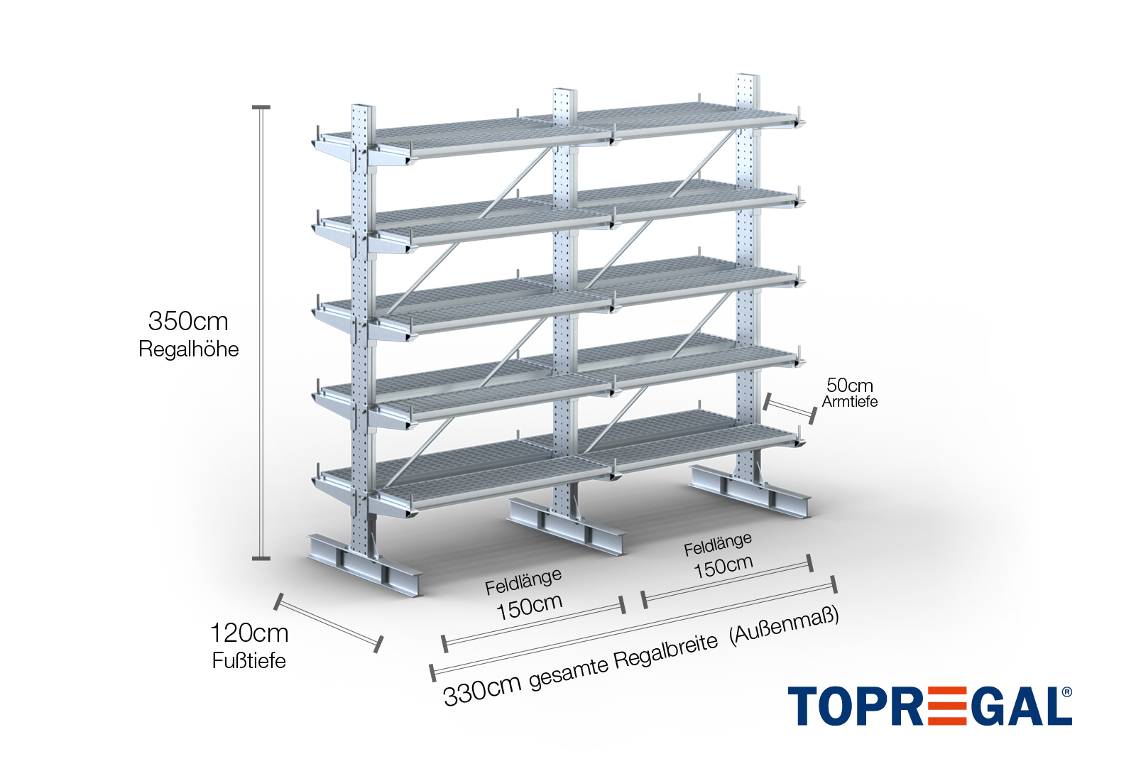 3,3 m draagarmstelling KR3000 / thermisch verzinkt / dubbelzijdig / 3,5 m hoog / 50 cm dragarmdiepte / 5 niveaus / bodem galvaniseerd rooster