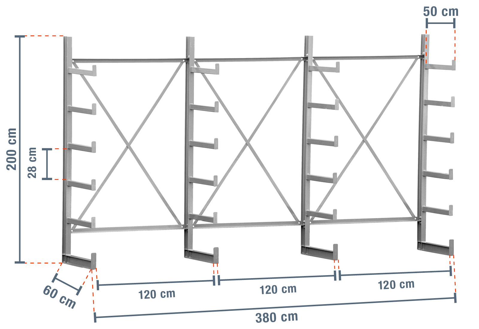De 50 cm diepe draagarmen in thermisch verzinkte uitvoering zijn ideaal voor de opslag van lang goederen.