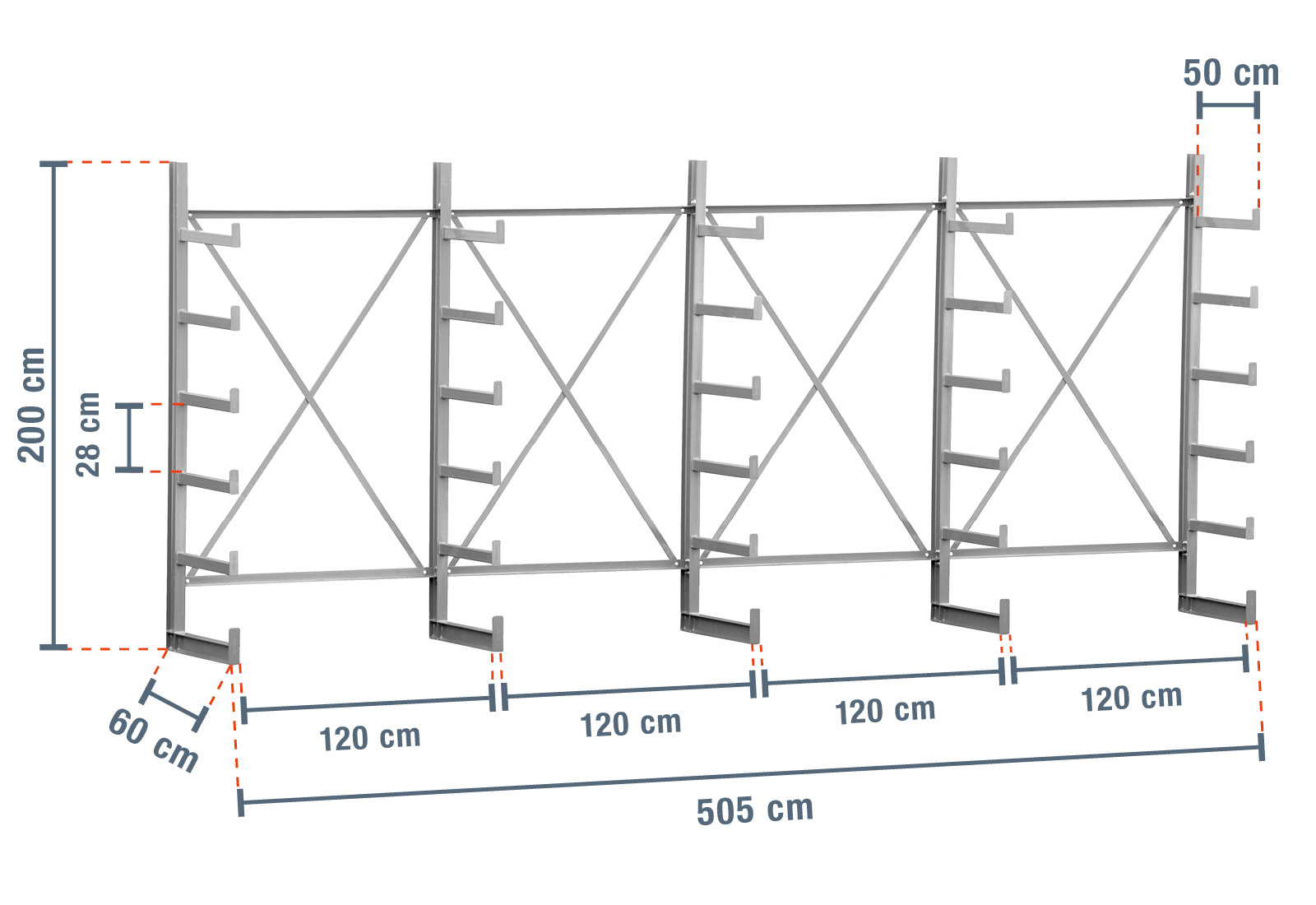 De 50 cm diepe draagarmen in thermisch verzinkte uitvoering zijn ideaal voor de opslag van lang goederen.