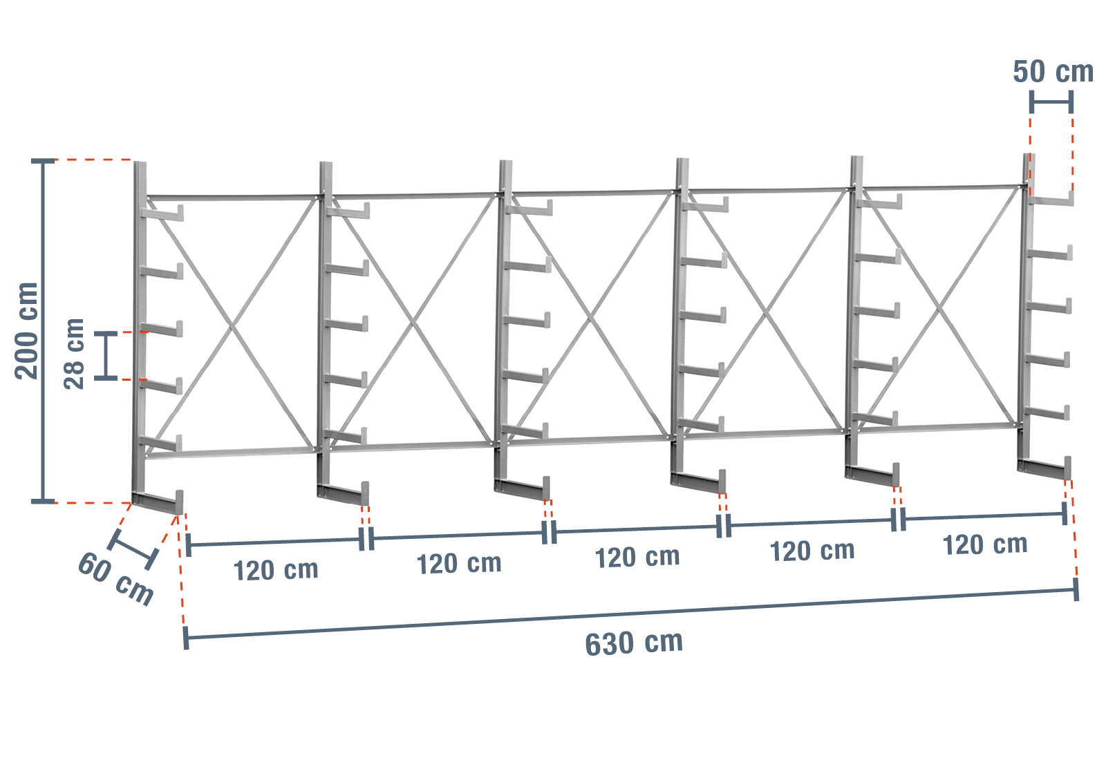 Deze bijzonder robuuste draagarmstelling met een breedte van 6,3 m is 2 m hoog en heeft 5 niveaus met een armdiepte van 50 cm. Dankzij de eenzijdige uitvoering met reeds aangelaste draagarmen kunt u elke staander met maximaal 1.250 kg belasten, waarbij elke arm een maximale belasting van 250 kg heeft.