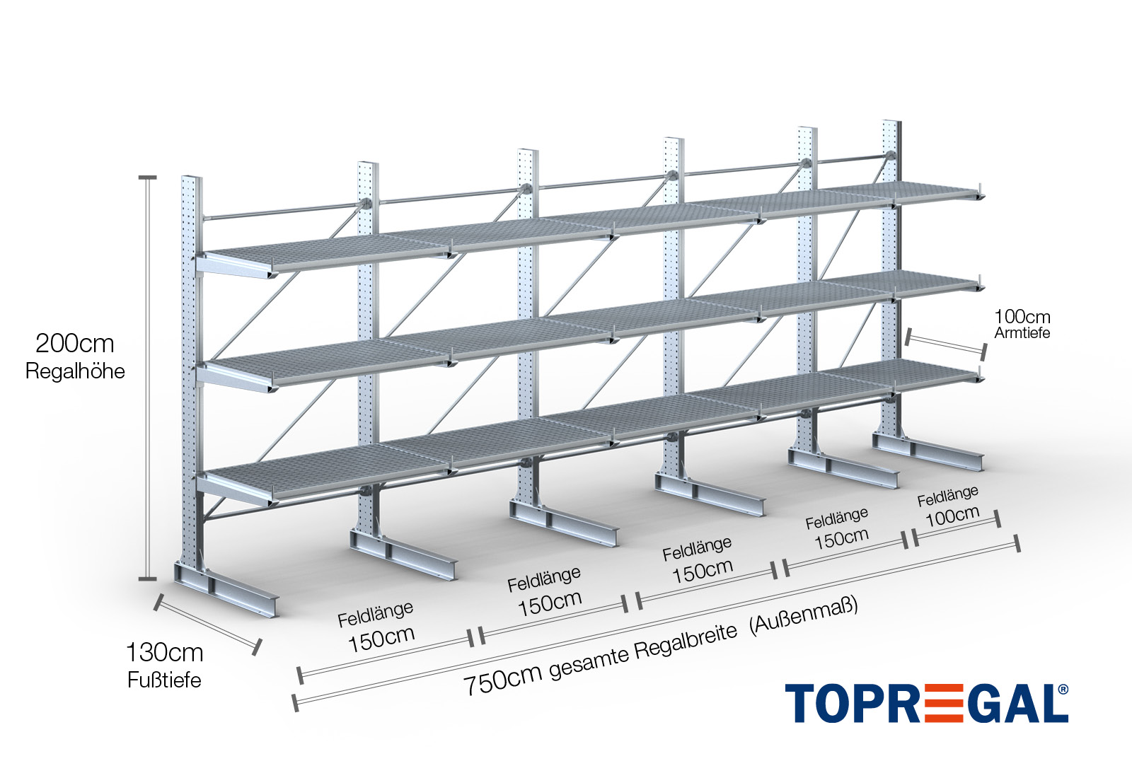 Deze draagarmstelling als eenzijdige uitvoering met een breedte van 7,5 m is 2 m hoog, heeft een totale diepte van 130 cm en beschikt over 3 draagarmniveaus, met een armdiepte van 100 cm. De belasting per arm bedraagt hierbij maximaal 500 kg. De draagarmen kunnen individueel in een rooster van 50 mm worden gehaakt en worden geborgd door middel van veiligheidsbouten en -pinnen. Ook de voetdelen kunnen (afhankelijk van de goederen) als opslagniveau worden gebruikt. Om de lading tegen onbedoeld verschuiven te beschermen, kan aan het einde van elke draagarm een afrolbeveiliging gestoken worden. Dit is standaard bij de leveringsomvang inbegrepen.