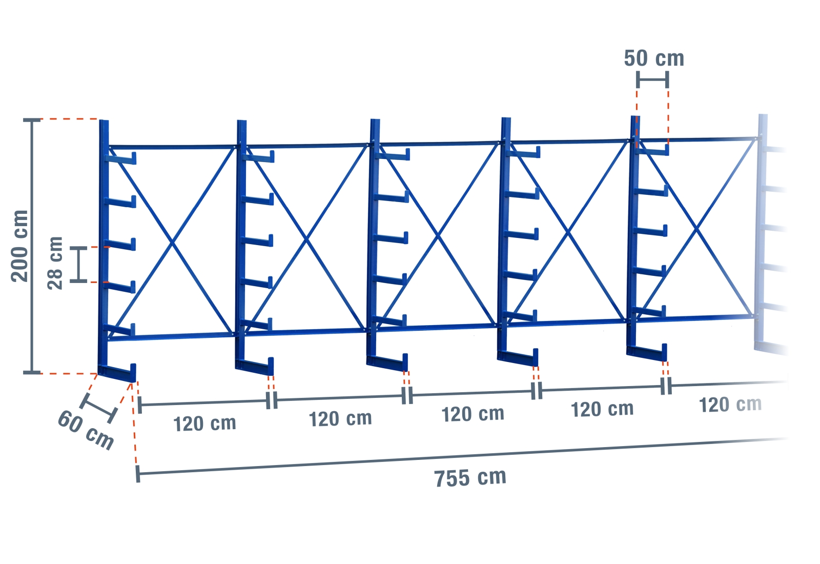 7,55 m draagarmstelling KR2500 / gelakt / enkelzijdig / 2 m hoog / 5 niveaus / 50 cm dragarmdiepte