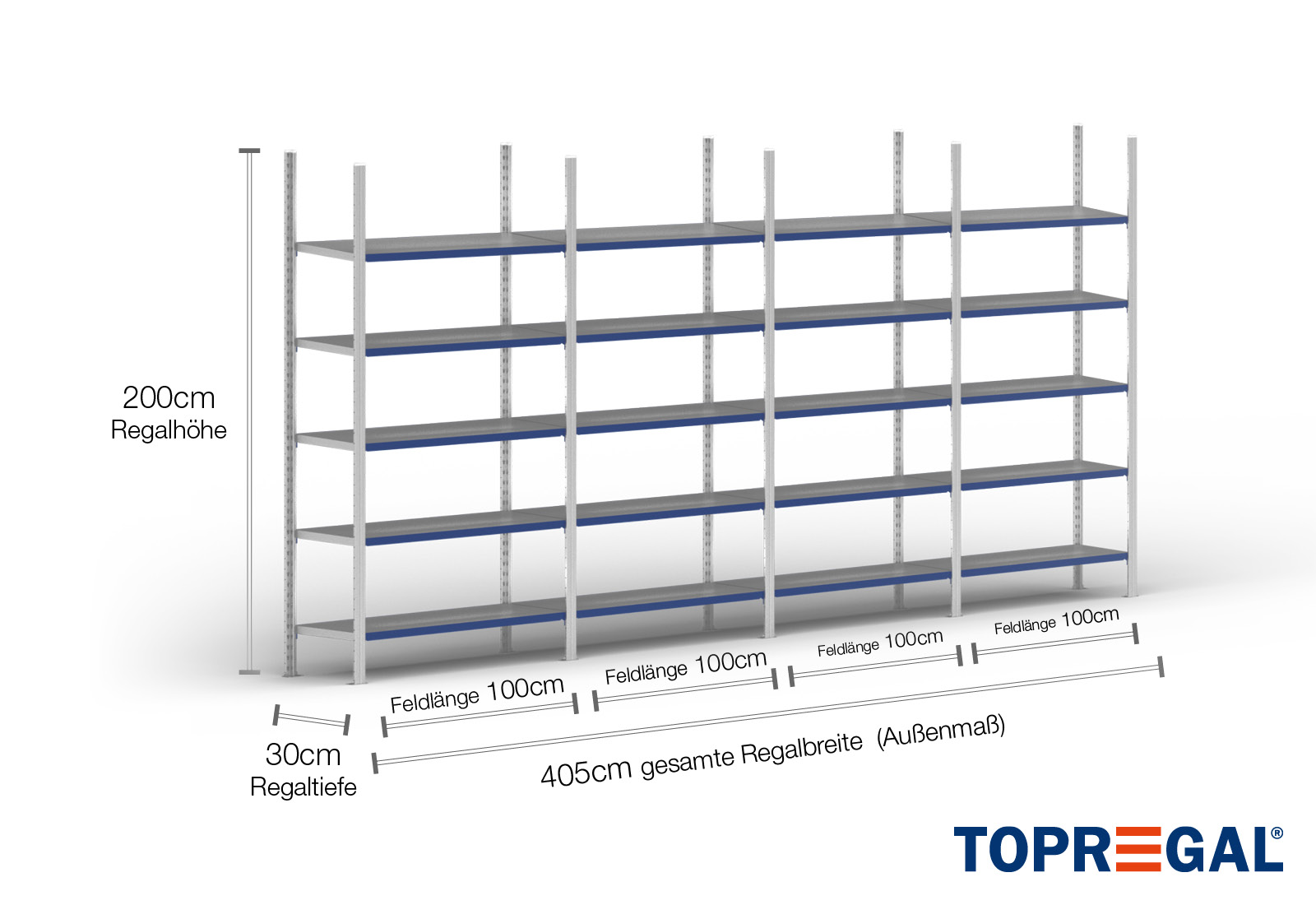 4 m legbordstelling FB200 / 30 cm diep / 2 m hoog / 5 niveaus / bodem staal / bodemgewicht 200 kg