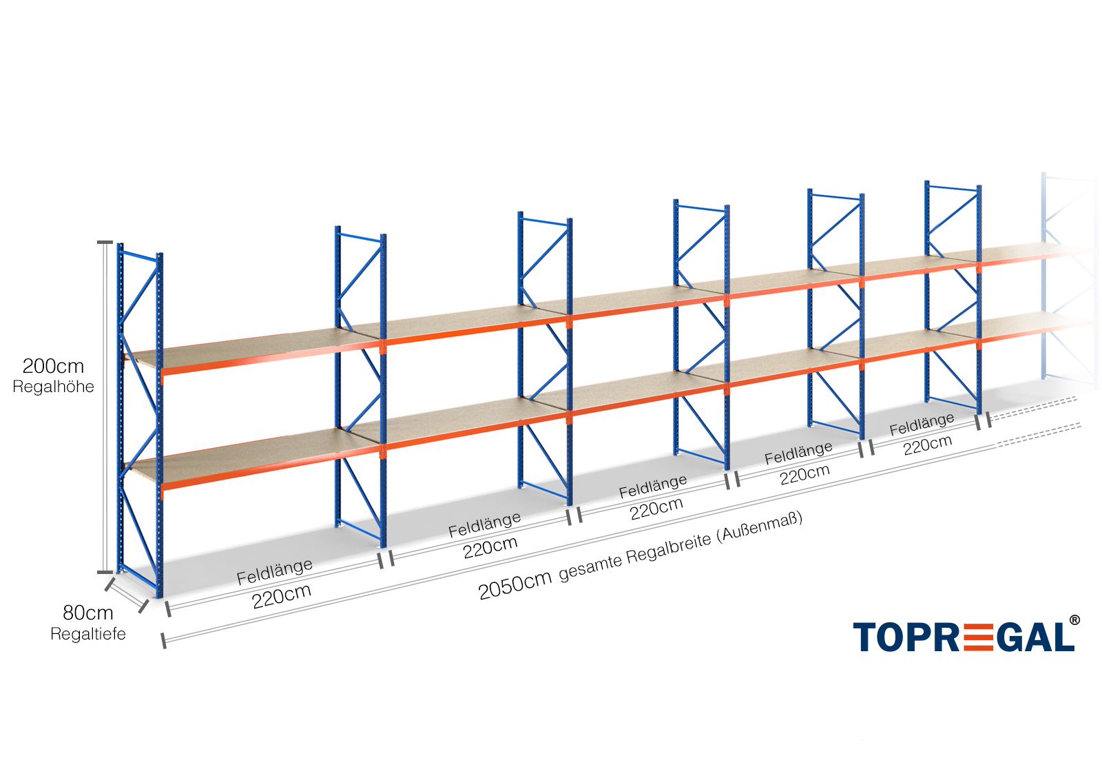 Deze magazijnstelling overtuigt met een hoogte van 2 m, is 80 cm diep en heeft een breedte van 20,5 m. De 2 niveaus bieden een maximale belasting van 500 kg per niveau, waarbij de maximale belasting tussen twee staanders (de schaplast) van 2.000 kg niet mag worden overschreden. Deze specificaties hebben altijd betrekking op een gelijkmatige belasting van de stellingen. De opbouw is dankzij het inhaaksysteem probleemloos en snel mogelijk. Voor de stellingen met brede overspanning van TOPREGAL is er bovendien een omvangrijke keuze aan onderdelen en accessoires, zoals stellingstaanders, traversen, magneetbanden en halfopen magazijnkratten.