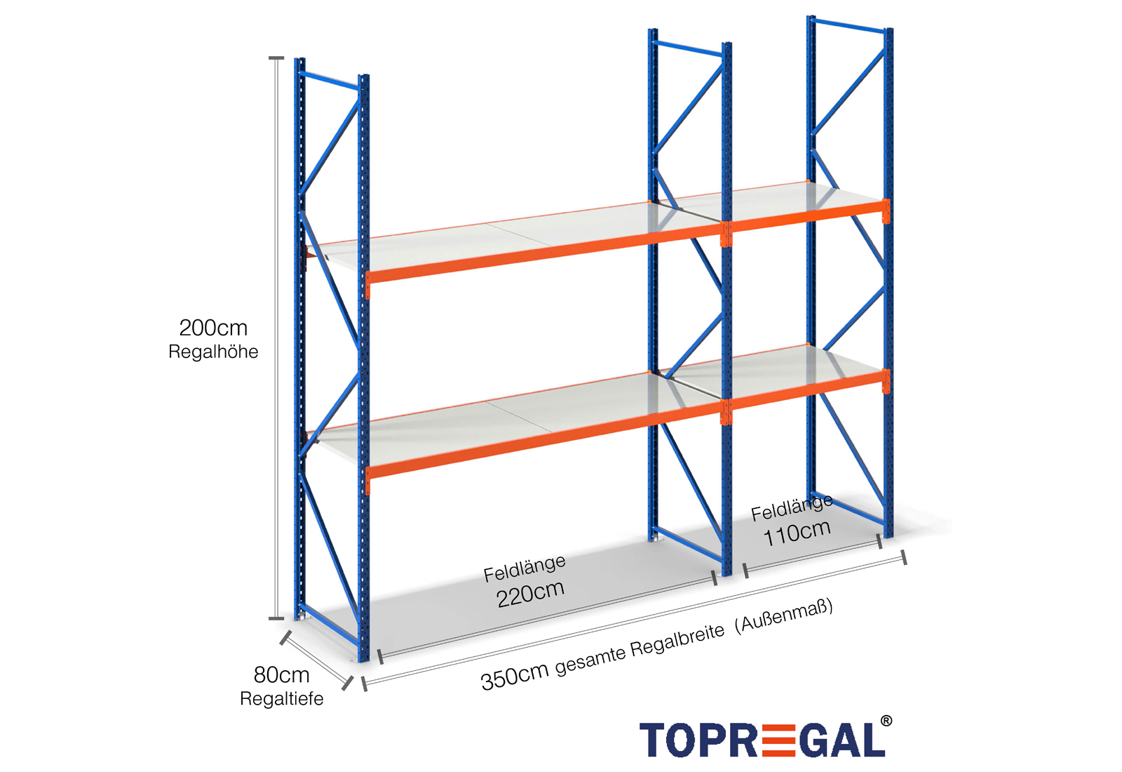 Deze magazijnstelling overtuigt met een hoogte van 2 m, is 80 cm diep en heeft een breedte van 3,5 m. De 2 niveaus bieden een maximale belasting van 500 kg per niveau, waarbij de maximale belasting tussen twee staanders (de schaplast) van 2.000 kg niet mag worden overschreden. Deze specificaties hebben altijd betrekking op een gelijkmatige belasting van de stellingen. De opbouw is dankzij het inhaaksysteem probleemloos en snel mogelijk. Voor de stellingen met brede overspanning van TOPREGAL is er bovendien een omvangrijke keuze aan onderdelen en accessoires, zoals stellingstaanders, traversen, magneetbanden en halfopen magazijnkratten.
