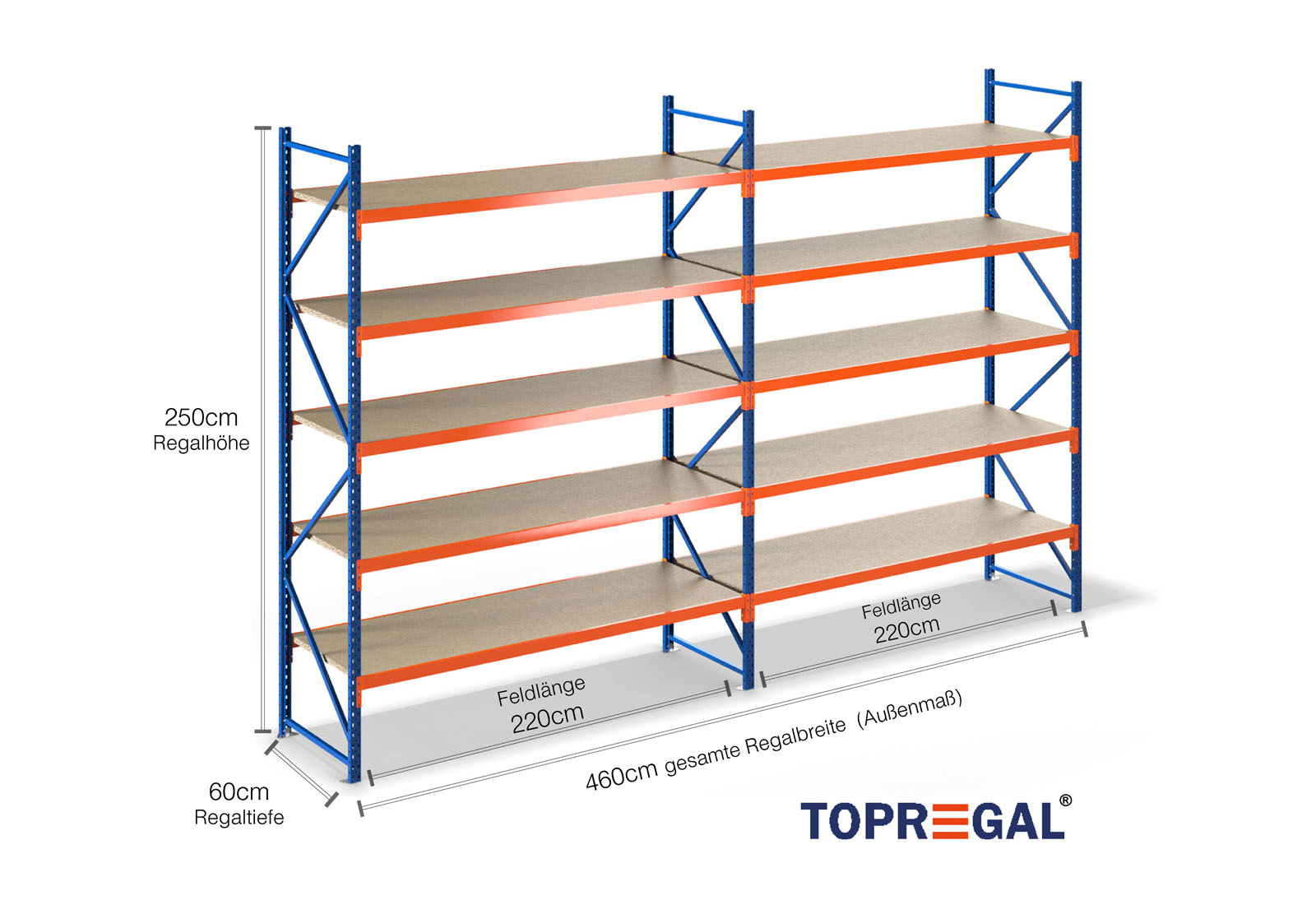 4,6 m magazijnstelling LR2000 / 60 cm diep / 2,5 m hoog / 5 niveaus / bodem hout