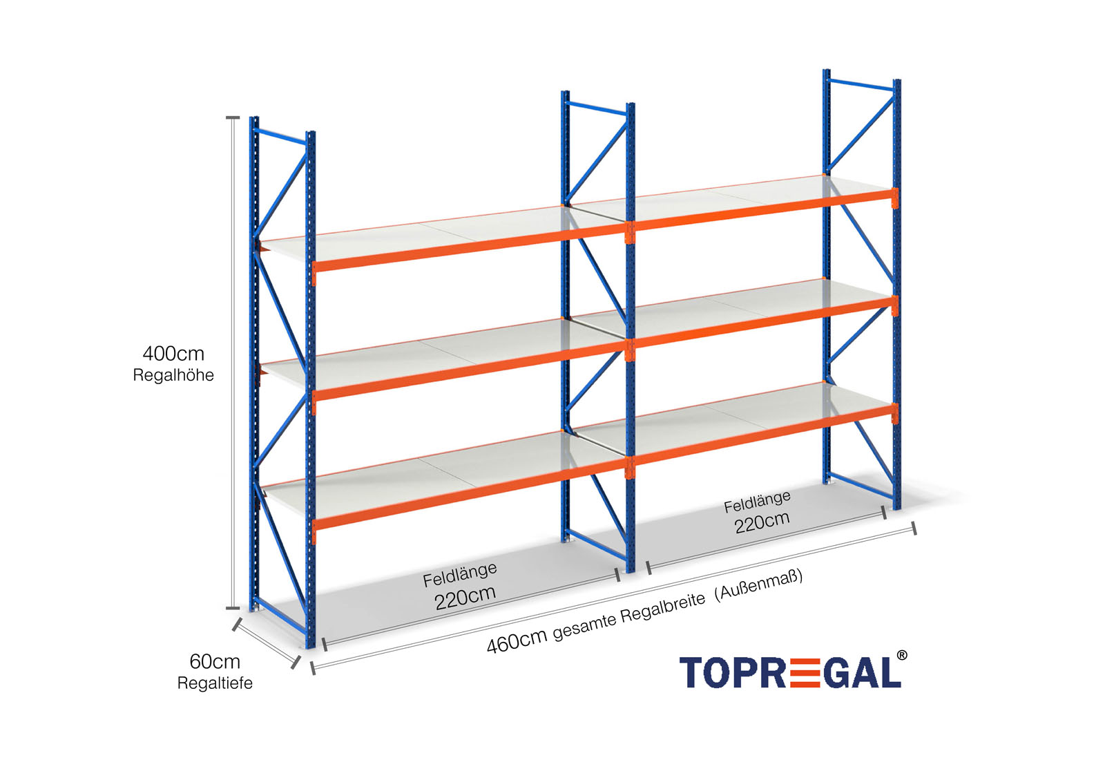 Deze magazijnstelling overtuigt met een hoogte van 4 m, is 60 cm diep en heeft een breedte van 4,6 m. De 3 niveaus bieden een maximale belasting van 500 kg per niveau, waarbij de maximale belasting tussen twee staanders (de schaplast) van 2.000 kg niet mag worden overschreden. Deze specificaties hebben altijd betrekking op een gelijkmatige belasting van de stellingen. De opbouw is dankzij het inhaaksysteem probleemloos en snel mogelijk. Voor de stellingen met brede overspanning van TOPREGAL is er bovendien een omvangrijke keuze aan onderdelen en accessoires, zoals stellingstaanders, traversen, magneetbanden en halfopen magazijnkratten.