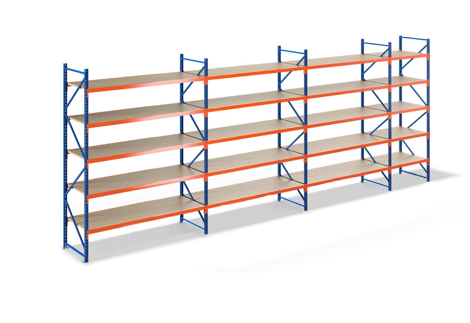 8,0 m magazijnstelling LR2000 / 60 cm diep / 2,5 m hoog / 5 niveaus / bodem hout