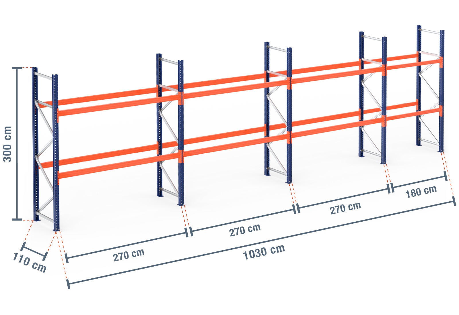 10,3 m palletstelling PR9000 / 110 cm diep / 3 m hoog / 2 niveaus voor 33 europallets