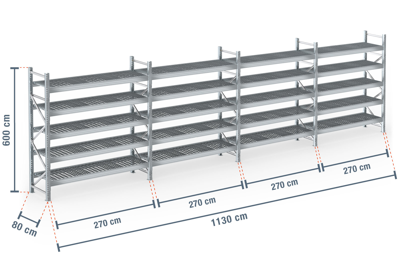 11,3 m palletstelling PR9000F thermisch verzinkt / 80 cm diep / 6 m hoog / 5 niveaus / bodem galvaniseerd rooster