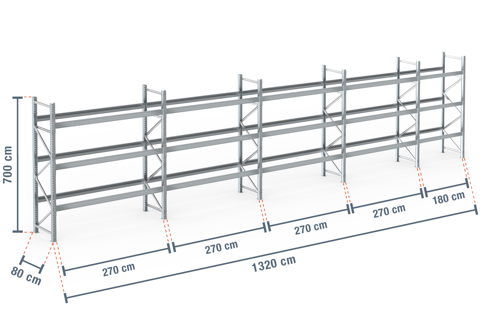 13,2 m palletstelling PR9000F thermisch verzinkt / 80 cm diep / 7 m hoog / 3 niveaus voor 56 europallets