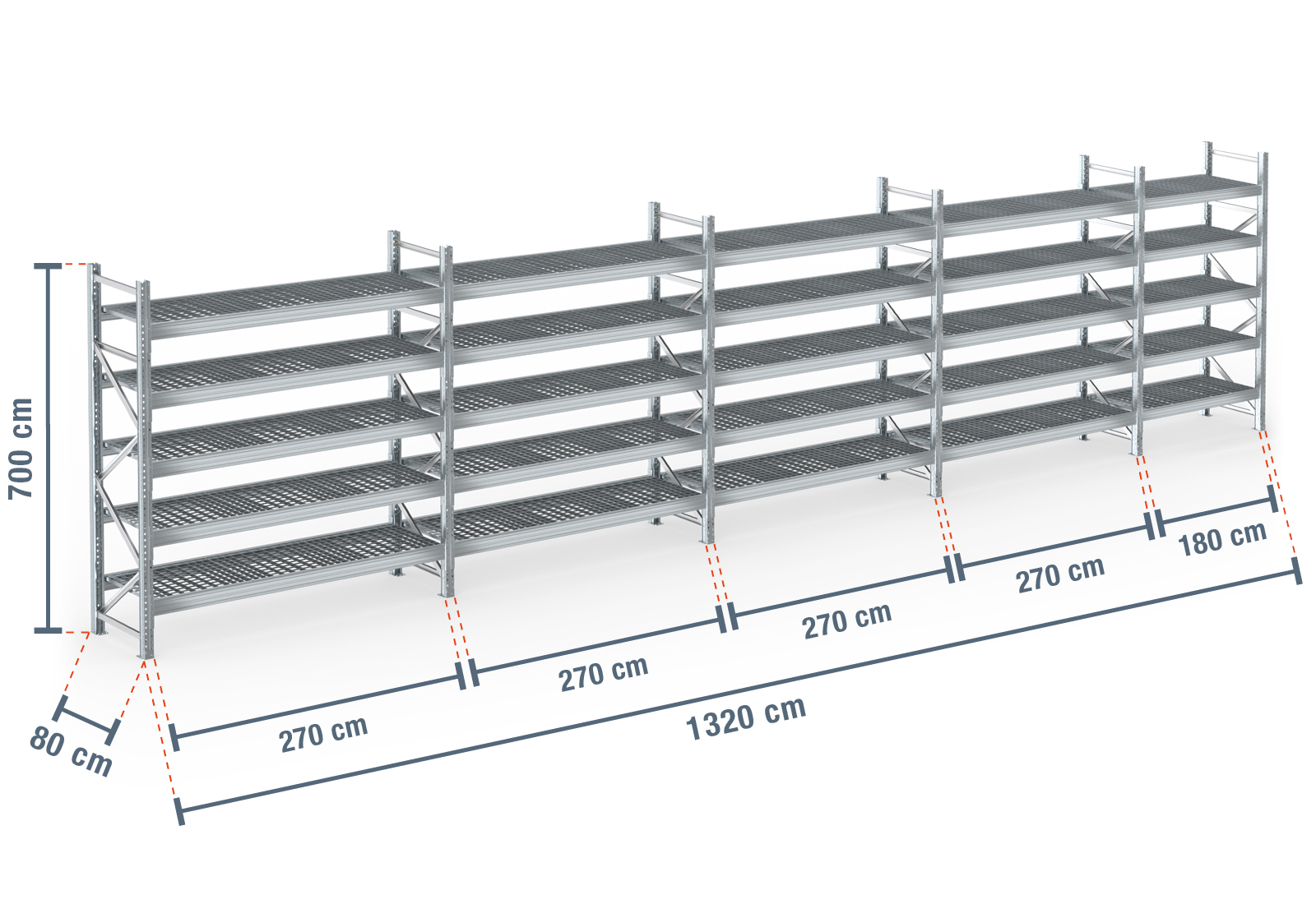 13,2 m palletstelling PR9000F thermisch verzinkt / 80 cm diep / 7 m hoog / 5 niveaus / bodem galvaniseerd rooster