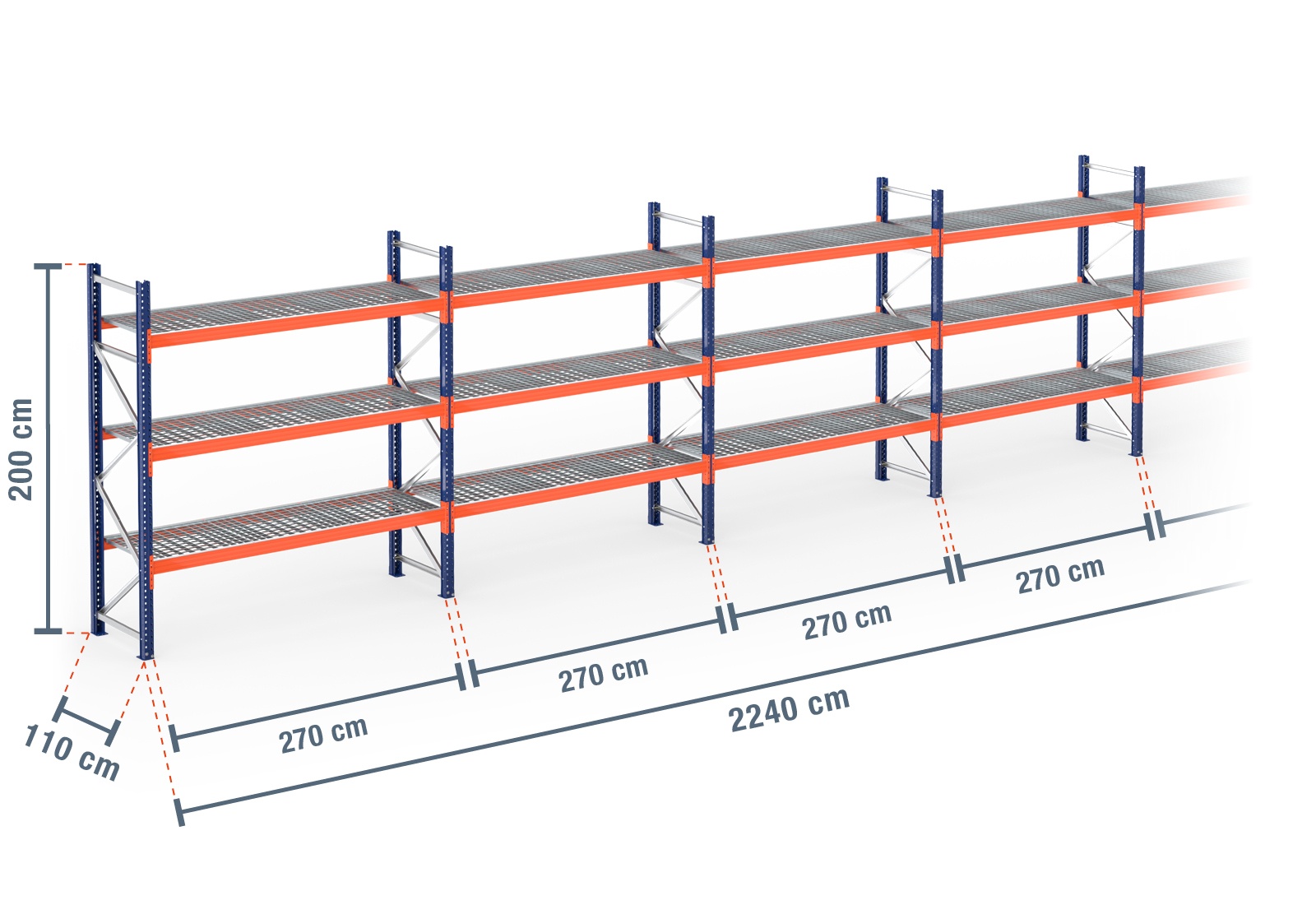 22,4 m palletstelling PR9000 / 110 cm diep / 2 m hoog / 3 niveaus / bodem galvaniseerd rooster