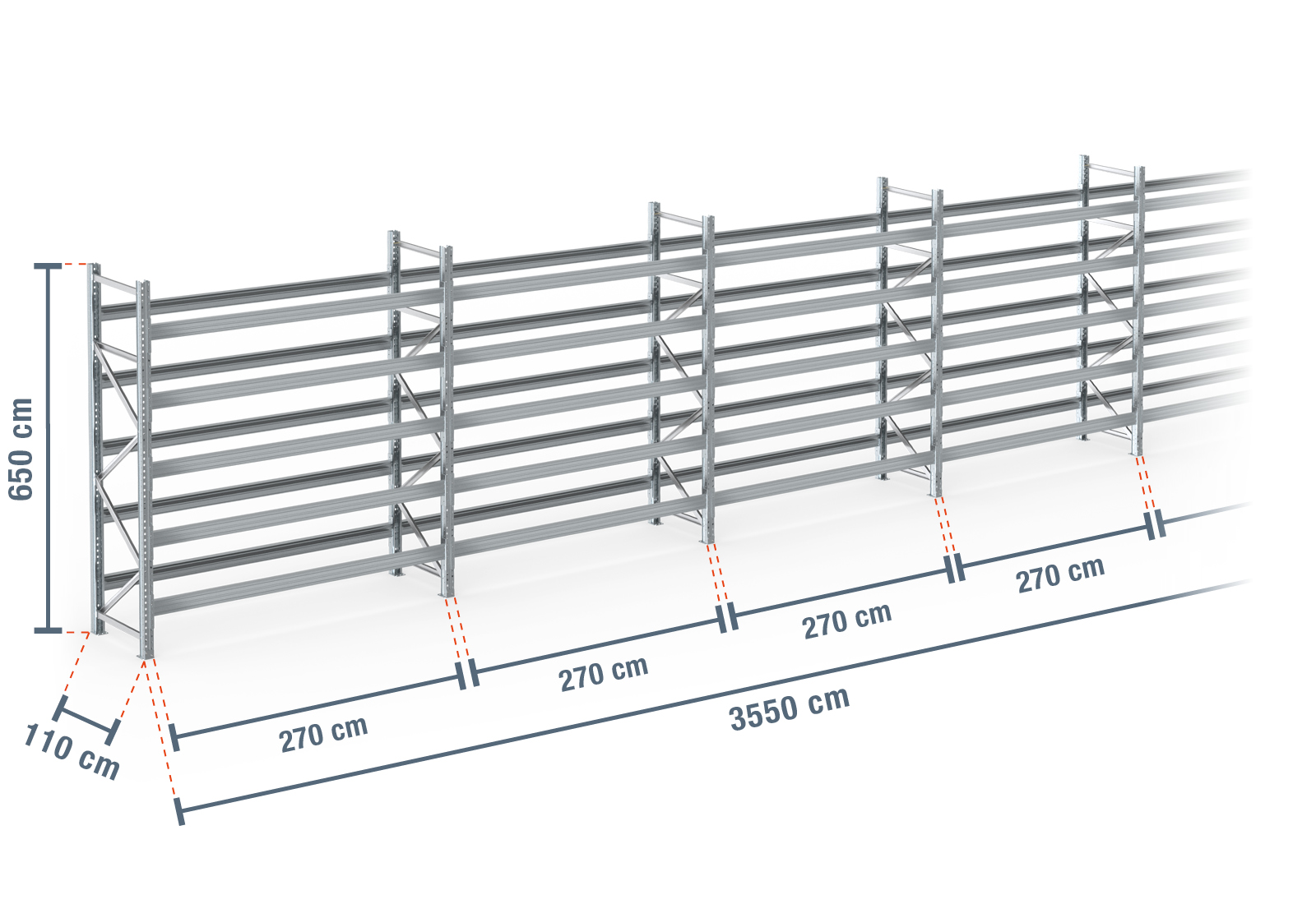 35,5 m palletstelling PR9000F thermisch verzinkt / 110 cm diep / 6,5 m hoog / 5 niveaus voor 228 europallets
