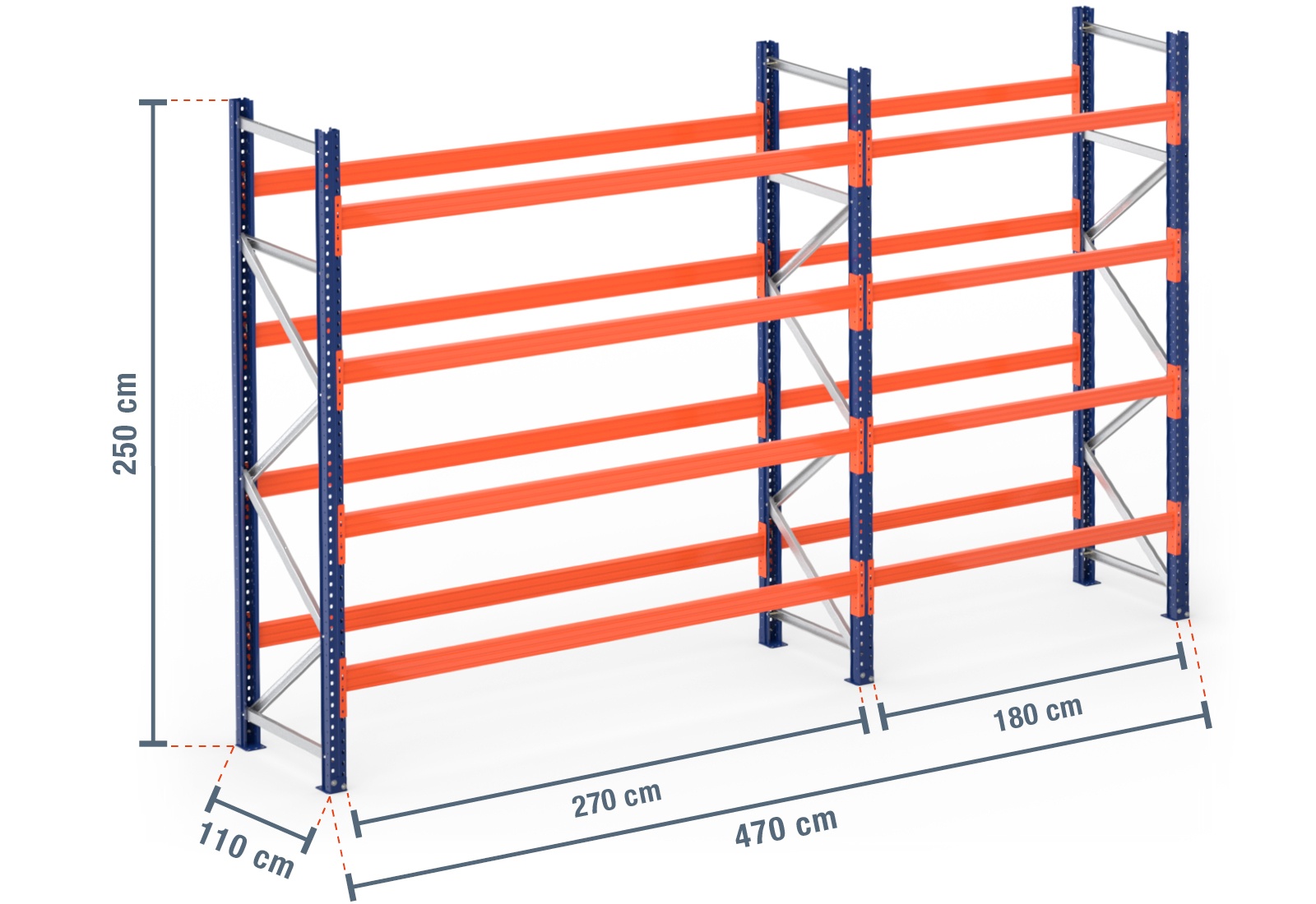 De traversen zijn gepoedercoat in de opvallende oranje kleur om voor veiligheid op de werkplek te zorgen. Ze kunnen eenvoudig als insteekconstructie in de stellingstaanders worden gehangen. Extra veiligheidspinnen beschermen de traverse tegen onbedoeld optillen en zorgen zo voor veiligheid. De staanders voor palletstellingen bestaan uit twee blauw gepoedercoate staanderprofielen. Het voorste en het achterste staanderprofiel worden met behulp van dwars- en diagonaalstutten aan elkaar vastgeschroefd en zorgen zo voor bijzonder veel stabiliteit. Om deze stabiliteit nog verder te garanderen, worden 2 voetplaten per stellingstaander aan de onderste uiteinden gemonteerd en met  ankerbouten stevig in de bodem verankerd. Daarmee kan onze modulaire palletstelling niet alleen worden gepersonaliseerd, maar is deze dankzij de bevestiging in de bodem ook bijzonder veilig.