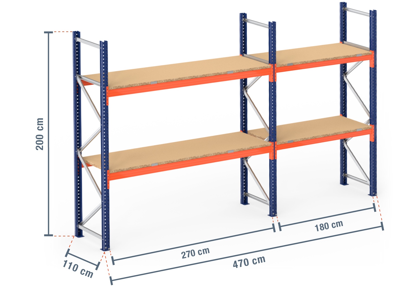 4,7 m palletstelling PR9000 / 110 cm diep / 2 m hoog / 2 niveaus / bodem hout