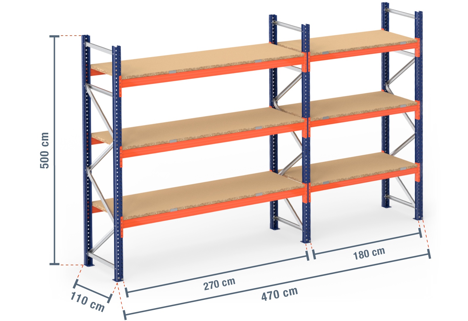 4,7 m palletstelling PR9000 / 110 cm diep / 5 m hoog / 3 niveaus / bodem hout