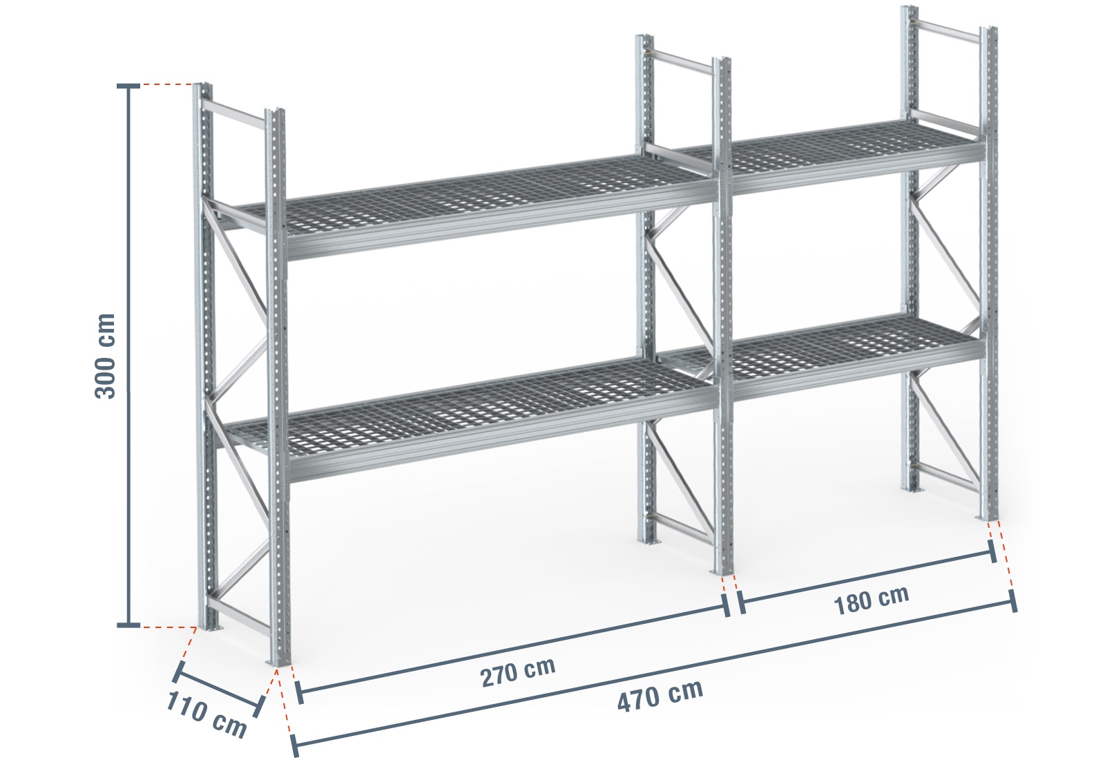 4,7 m palletstelling PR9000F thermisch verzinkt / 110 cm diep / 3 m hoog / 2 niveaus / bodem galvaniseerd rooster