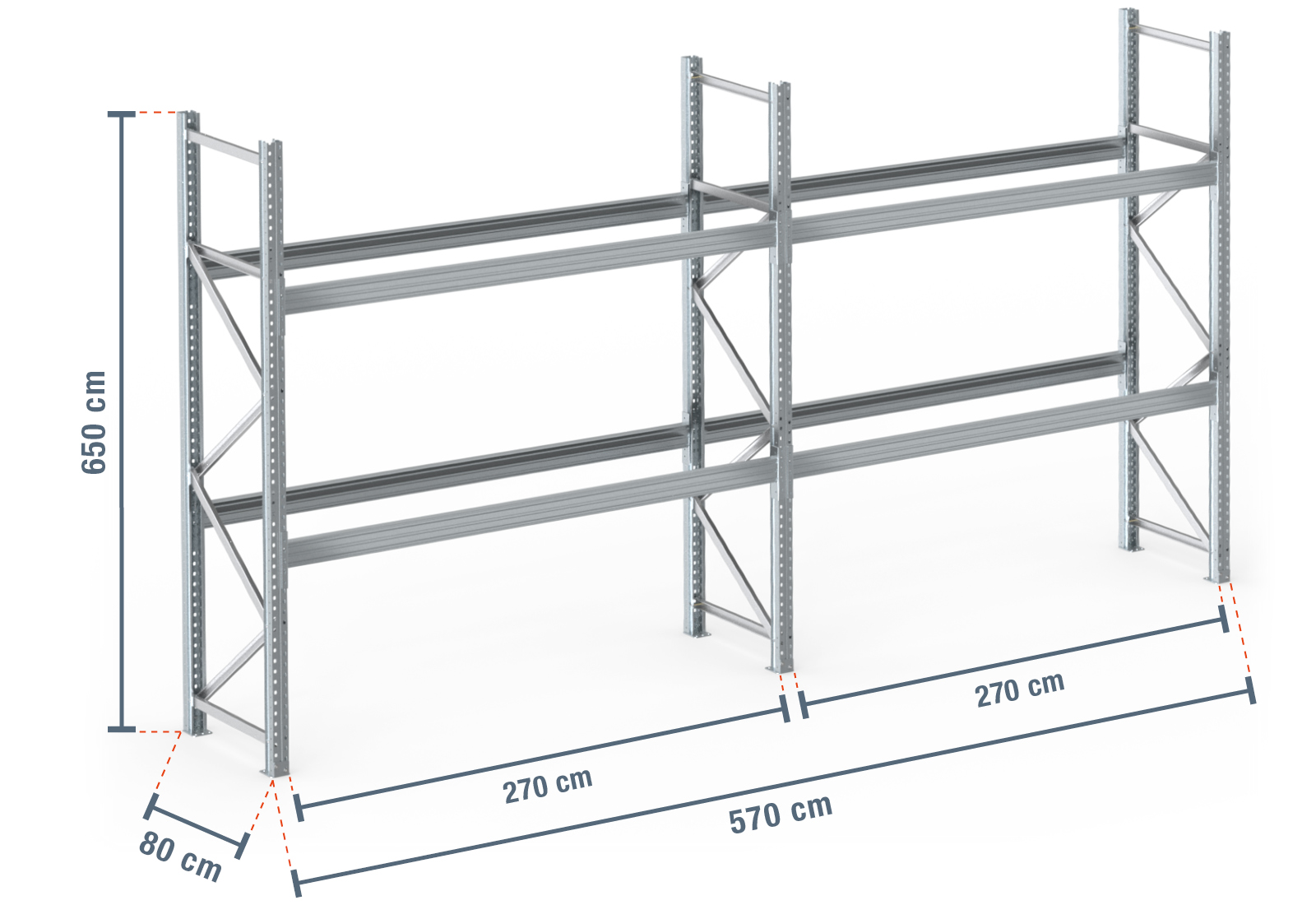 5,7 m palletstelling PR9000F thermisch verzinkt / 80 cm diep / 6,5 m hoog / 2 niveaus voor 18 europallets