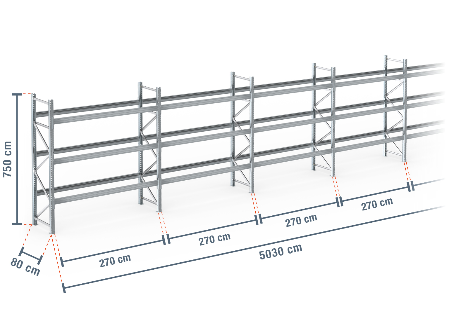 50,3 m palletstelling PR9000F thermisch verzinkt / 80 cm diep / 7,5 m hoog / 3 niveaus voor 216 europallets