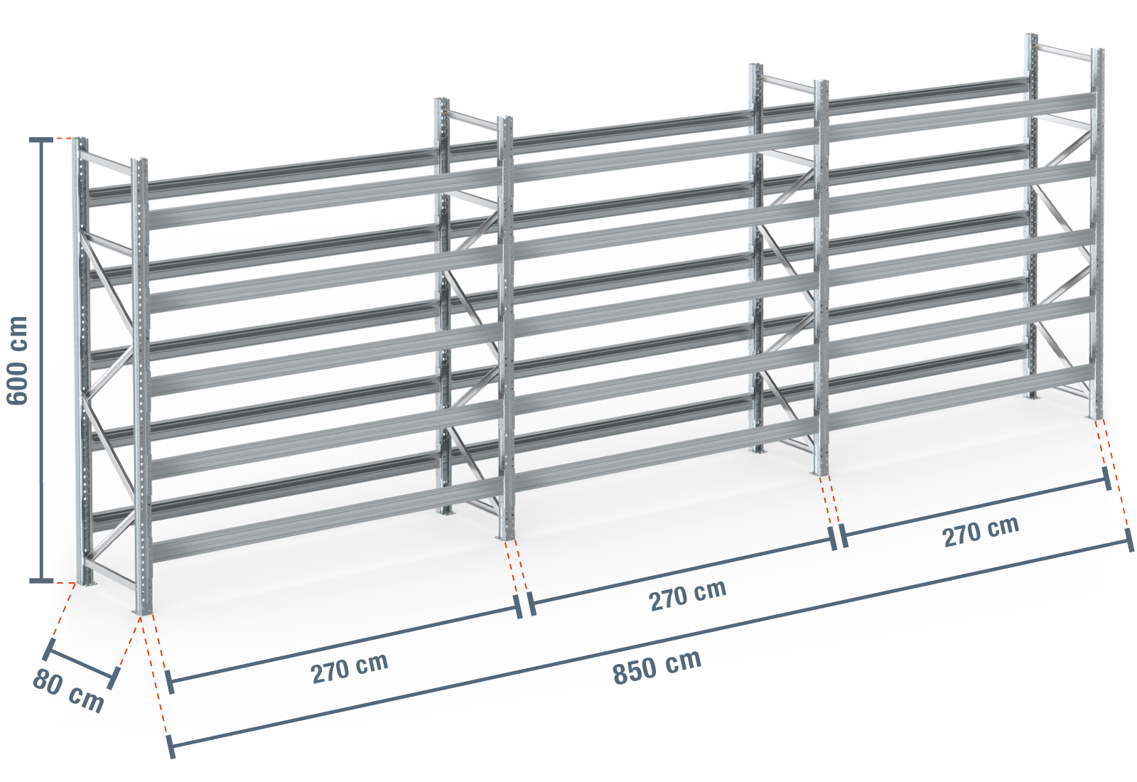 8,5 m palletstelling PR9000F thermisch verzinkt / 80 cm diep / 6 m hoog / 5 niveaus voor 54 europallets
