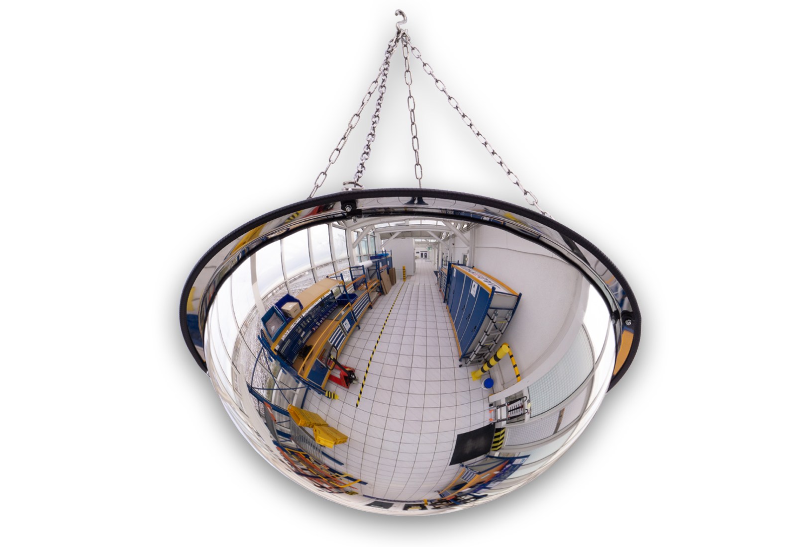 De panoramische spiegel van TOPREGAL biedt u een schitterend zicht rondom voor het beveiligen van onoverzichtelijke plaatsen, kruispunten en gangpaden. De halfronde vorm van de industriële spiegel maakt een zicht van 360° mogelijk en dus het perfecte overzicht om ongelukken en diefstal te voorkomen. De veiligheidsspiegel is bij uitstek geschikt voor vorkheftruckverkeer, in de logistiek, verkoopruimten, magazijnen, industrie en handel, want hij versnelt de doorstroming van het verkeer op een kosteneffectieve en veilige manier. De panoramische spiegel, met een diameter van 800 mm, is gemaakt van slagvast acrylglas, heeft een beschermende rubberen strip en een laag eigen gewicht van slechts 1,5 kg. De maximale waarnemingsafstand is 10 m. De installatie is moeiteloos dankzij de meegeleverde montagekit, waarmee u de spiegel ofwel rechtstreeks aan het plafond kunt bevestigen met pluggen en schroeven door de vier voorgeboorde gaten, ofwel kunt ophangen met de vier meegeleverde kettingen en S-haken. Om te voorkomen dat het tijdens het vervoer beschadigd wordt, is het afgedekt met een beschermende folie.