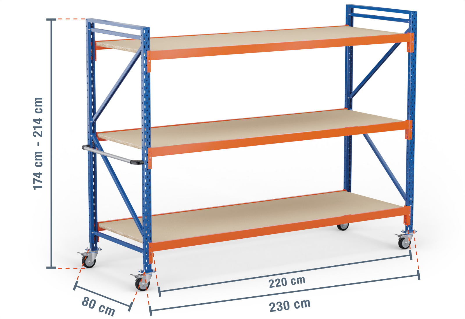 2,3 m magazijnstelling verrijdbaar LR2000 / 80 cm diep / 1.740 - 2.140 mm hoog / 3 niveaus / bodem hout