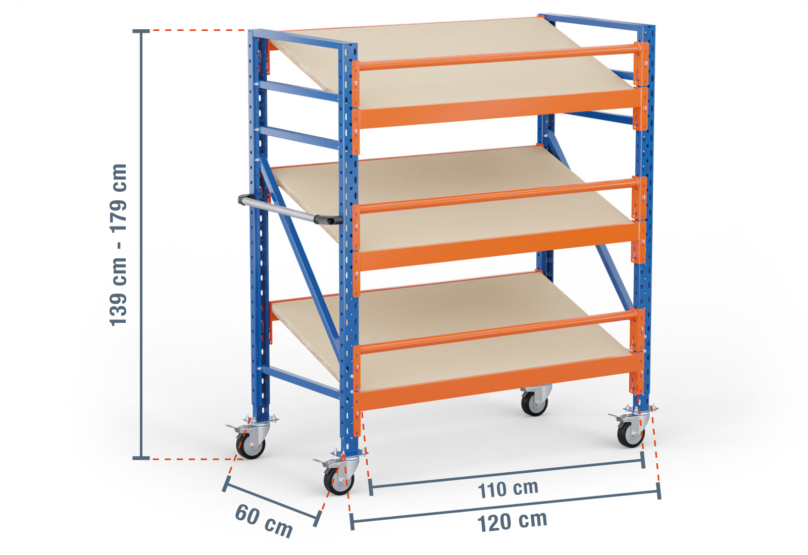 Deze verrijdbare stelling met schuine bodemen van TOPREGAL bestaat uit 3 niveaus, die elk zijn voorzien van een schuin geplaatste, houten stellingbodem. Eén niveau beschikt bovendien over twee traversen met meerdere niveaus, die de eigenlijke last dragen en een buistraverse die als valbeveiliging wordt gebruikt. De traversen zijn gelakt in de kleur oranje en kunnen individueel in een rooster van 50 mm ingehangen worden Zo verbetert u de ergonomie van uw stelling en kunt u uw vakken met de optimale grootte configureren.