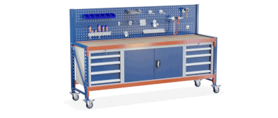 Ook in het assortiment werkbankaccessoires bieden wij integreerbare gereedschapskasten en gereedschapslades als optionele modules. De gereedschapskasten / gereedschapsladen zijn verkrijgbaar in twee dieptes, passend bij de gekozen werkbank. Ze zijn afsluitbaar en gemaakt van robuust staal. De deuren/lade-uittrekelementen in blauw zijn perfect afgestemd op de romp in discreet lichtgrijs. In de gereedschapskast zit een plank die naar behoefte op verschillende hoogtes kan worden ingehaakt. De tweede module, de gereedschapslade, bestaat uit 4 laden die elk voorzien zijn van een vakverdeling en eveneens afsluitbaar zijn.