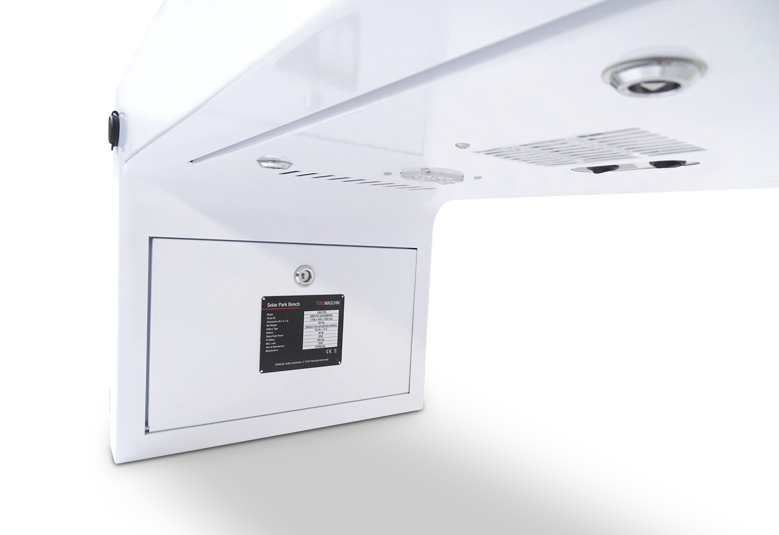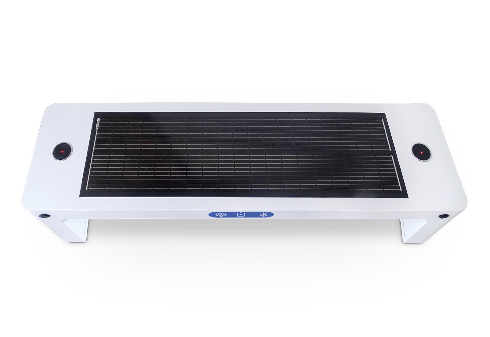 Het 90 W-zonnemodule is geïntegreerd in de zitting en heeft een robuust, weerbestendig oppervlak. De energie wordt opgeslagen in een Li-Ion (12 V / 55 Ah). Hierdoor blijven de oplaadpunten en de automatische LED-omgevingsverlichting ook bij wisselvallig weer functioneren. De lampjes onder de bank gaan automatisch aan als het donker wordt en gaan weer uit als er voldoende licht is. De verlichting werkt op 12 V, heeft een vermogen van 10 W en een kleurtemperatuur van ongeveer 3.500 K.